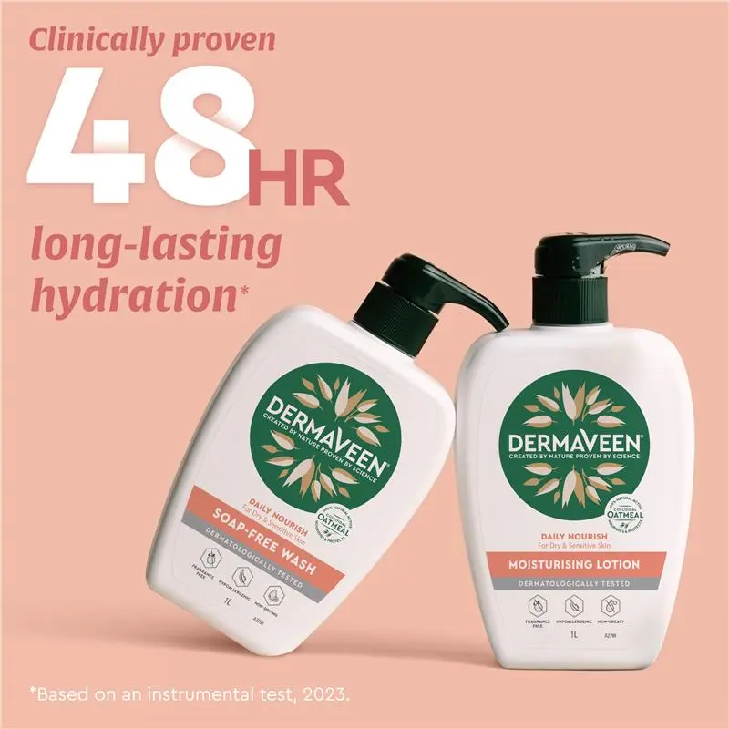 DermaVeen® Daily Nourish Moisturising Lotion is lightweight, non-greasy, and specifically formulated for dry or sensitive skin. The unique soothing lotion forms a protective moisture layer, replenishes the skin barrier & locks in moisture leaving skin smooth, supple & healthy.