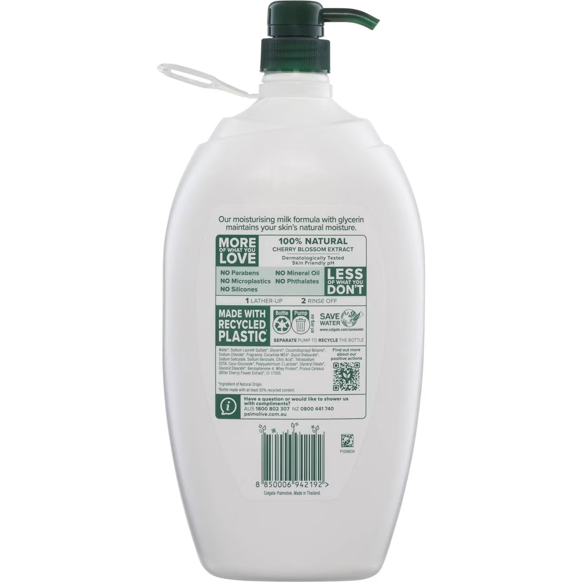 Palmolive Naturals Body Wash Cherry Blossom with moisturising milk formula is 95% natural origin. Our moisturising milk formula with glycerin maintains your skin's natural moisture. We're here to make great skincare products without complexity or compromise. Our Palmolive Naturals Cherry Blossom Body Wash with Moisturising Milk uses the best ingredients to help maintain your skin's natural moisture. At Palmolive we're all about giving you more of what you love and less of what you don't. That's why this Shower Gel is made with 100% Natural Cherry Blossom extracts and has a light and cherry scent with warm milky tones. What we leave out is as important as what we put in. • No Parabens • No Phthalates • No Mineral Oil • No Alcohol • No Silicones • No Soap • No Gluten • No BPA This product has been formulated with skin loving ingredients and is dermatologically tested and pH balanced to suit your skin. Please recycle us! This bottle is recyclable. Pack Size: 1.8L Body Wash Product Claims: Dermatologically tested, skin friendly pH. No Parabens, no microplastics, no silicones, no mineral Oil, no phthalates Size: 1.8L Scent: Cherry Blossom Dermatologist Tested?: Yes KEY FEATURES • BODY WASH WITH NATURAL EXTRACTS: Palmolive Naturals Milk & Cherry Blossom Body Wash is made with 100 percent Natural Cherry Blossom Extracts with Moisturising Milk • FORMULATED WITH SKIN LOVING INGREDIENTS: Our Palmolive Naturals Body Wash are made with skin loving ingredients which are dermatologically tested and pH Balanced to suit your skin • MORE OF WHAT YOU LOVE AND LESS OF WHAT YOU DON'T: Palmolive Shower Gel are FREE from Parabens, Phthalates, Mineral Oil, Alcohol, Silicones, Soap, Animal Derivatives, Gluten and BPA • CHERRY BLOSSOM SCENT: Enjoy the smell of spring with cherry blossoms, violet and jasmine notes, softened by vanilla and almond. • RECYCLABLE: Palmolive Naturals Body Wash are made with a recyclable bottle