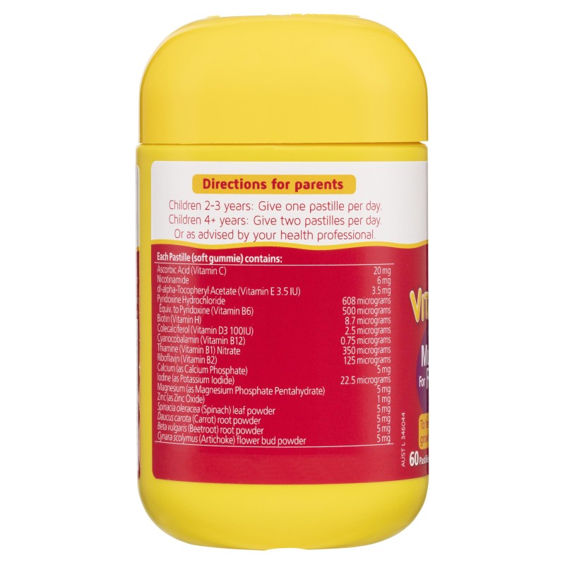 Children 2-3 years: Give one pastille per day Children 4+ years: Give two pastilles per day. Or as advised by your health professional Vitamins and minerals can only be of assistance if dietary intake is inadequate. Store below 25 C